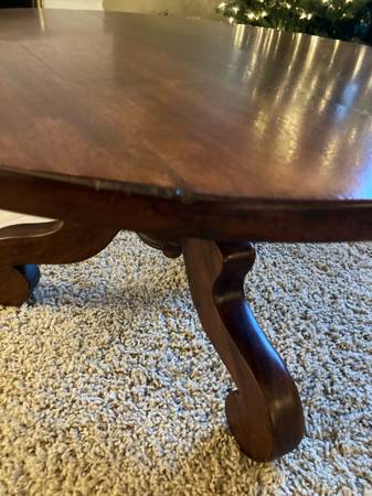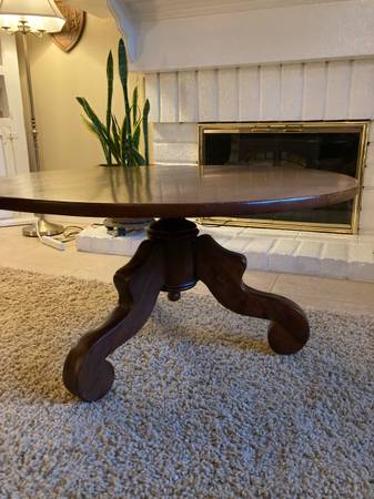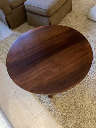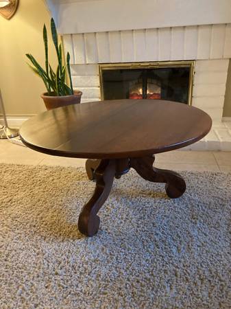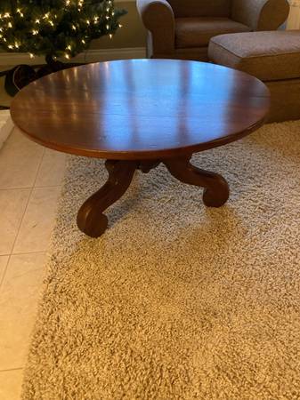 Coffee Table, solid wood, good condition, chunky wood legs, 36” round, 19” tall Pickup and cash only