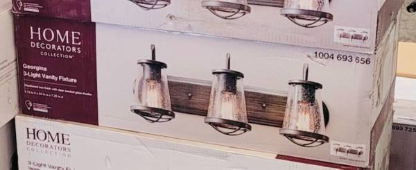 New Georgia, 3 Light vanity fixture with weathered iron finish with clear seeded glass shades from Home Decorators. Call at
