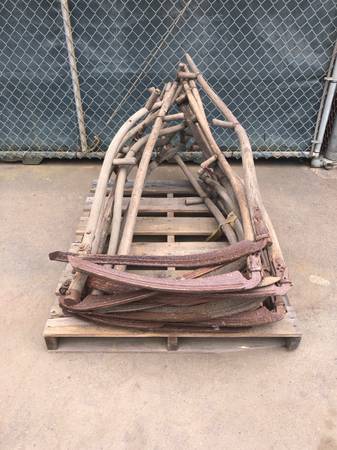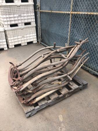 Sickles / scythed with two wooden handles. Approximately 65” long with iron blades. Some blades 18” some 27”. Zoom in on pictures to see condition. Some vary in condition.