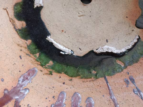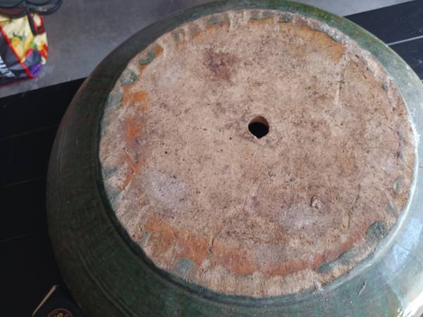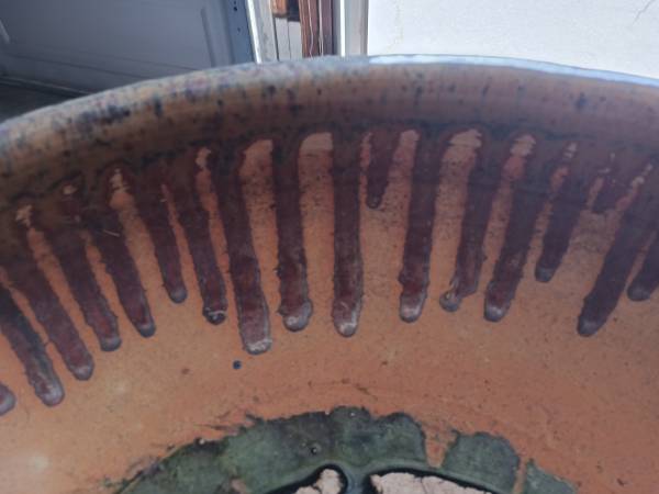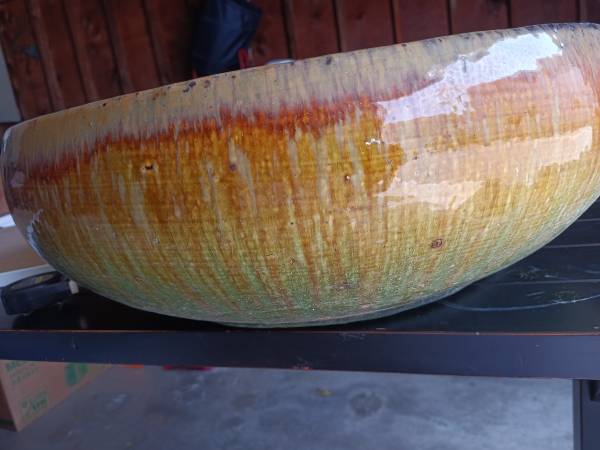 Vintage Heavy GLAXED ceramic pot from the 70'smeasuring 6.5" high x 21" in diameter and is 3/4" thick. Hard to find. My price 75.00 firm Near mint condition. Without cracks or chips.