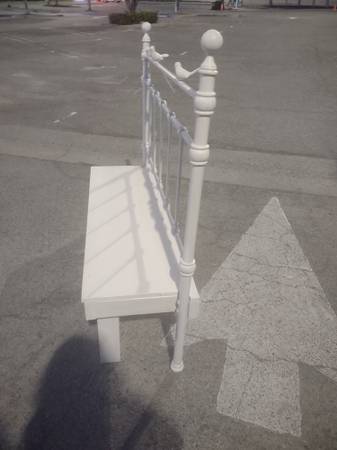 Very nice looking garden bench. Made from a bed frame. Sturdy. 51 inches across seat x 17 inches deep x 17 inch high seat x 50 inch high metal back frame x 54 inches total width Phone # is a...