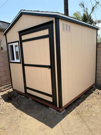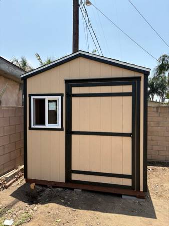 Upgrade your backyard with a durable, custom-built 8x8 storage shed in a stylish brown and tan color combo. Features a classic barn door design for easy access and a rustic look.