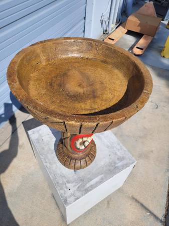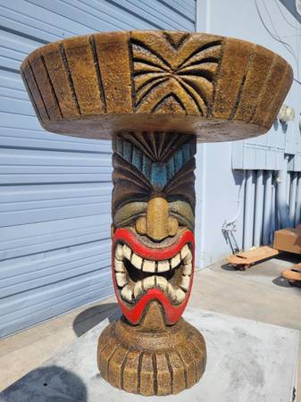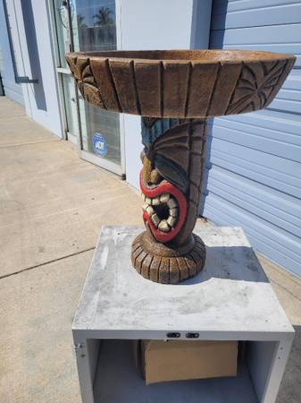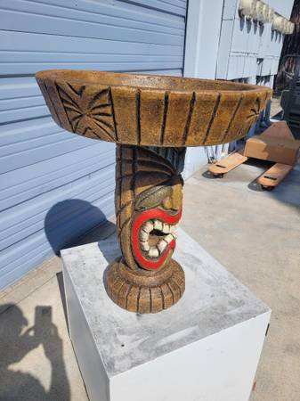 Hawaiian Polynesian Tiki Bird bath Solid Concrete 24 inches tall bird bath area is 21 inch diameter Acid stained and sealed for years of UV protection New Weighs about 70 ounds