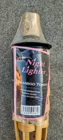 Brand new, unopened 57" Night Lighter Bamboo Torch. Features a flame keeper for a bigger and longer-lasting flame. The easy-fill wide mouth canister holds a 12 oz. can and ensures fewer spills and less mess. This pre-assembled torch comes with a displayer and is crafted from all-natural, renewable bamboo, reflecting the relaxed style of the tropics. It stands 57 inches tall and is perfect for outlining a laid-back entertainment space. For proven mosquito repellency, use with TIKI BiteFighter torch fuel and enjoy up to 5 hours of burn time with each 12-ounce fill. TIKI BiteFighter torch fuel sold separately.