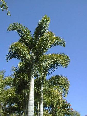 The exotic foxtail palm, Wodyetia bifurcata, is a very beautiful palm species. Gets to about a CA height of 20'.