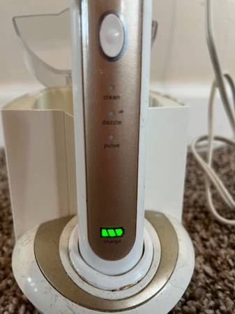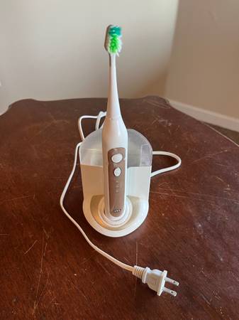 Electric toothbrush with charging base. Works perfectly, sanitized, of course will need a new brush head.