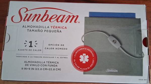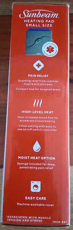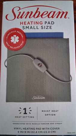 Sunbeam small heating pad, 9" X 9". Vinyl with cover. One setting. Like new, only used once. Great for human ailments or even pets.