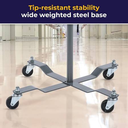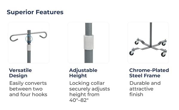 Adjustable Height 40"- 82". With easy push-pin release, it converts between a 2-hook and 4-hook top. NOTE: The 4-hook top is sold separately and NOT included. Weighted base provides strength and durability, while, most importantly, reducing the risk of tipping. A locking collar allows for simple height adjustment to the stem and four rubber wheels ensure smooth transportation and maneuverability.