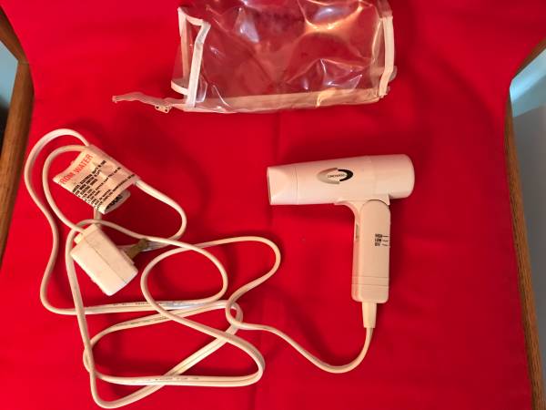 Travel Size HAIR DRYER by Concourse. Works great. Gets hot! Plug in. Long cord. Folds down into clear case for travel.