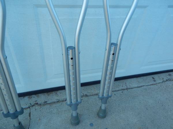 ALUMINUM CRUTCHES. 2 SETS BRAND: GUARDIAN HIGH QUALITY 3/4" DIAMETER ALUMINUM TUBING VERY ADJUSTABLE: HEIGHT HAS 9 DIFFERENT ADJUSTMENT POSITIONS... one set adjust from 5' 2" up to 5' 10" one set...