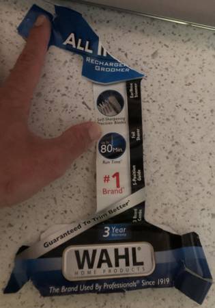 Wahl All-in-One hair and beard trimmer. Cordless, rechargeable. Rechargeable battery, charger, instructions, and accessories included. Attachments/accessories, comb, and lubricating oil still brand...