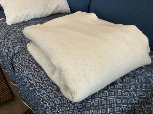This blanket appears to be a twin sized blanket and would seem to work well with a twin sized bed. It’s a relatively heavy blanket so it should be good for the cold weather. It’s been in a box in the garage for a while so it needs to be washed and I’ll leave that up to the new owner since I’m sure they’ll want to wash it anyway. But no holes or stitching issues or anything like that. It’s in pretty good condition overall. It’ll just need a wash in the washing machine and you should be good to go.