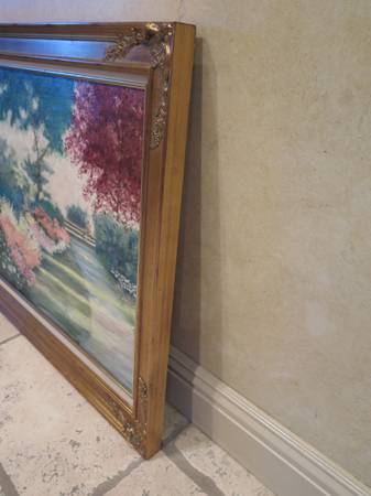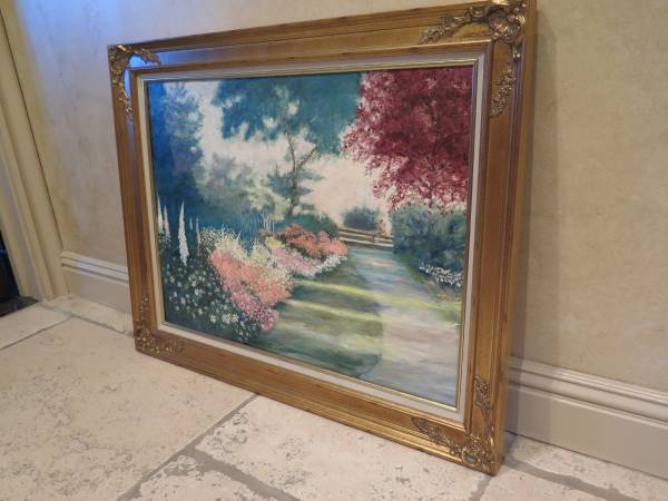 Beautiful Landscape Oil Painting of Child Playing and Mother Reading or Studying Framed Original Oil Pretty soft colors - greens Impressionist style painting Attractive gilded frame Very pretty...