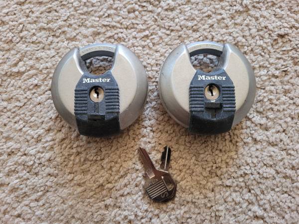 Set of Two Heavy Duty Diskpadlock MasterLock Padlocks with Interchangeable keys, so, one key can lock and unlock both locks and other key is a spare key