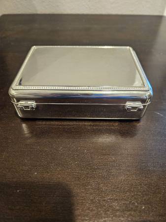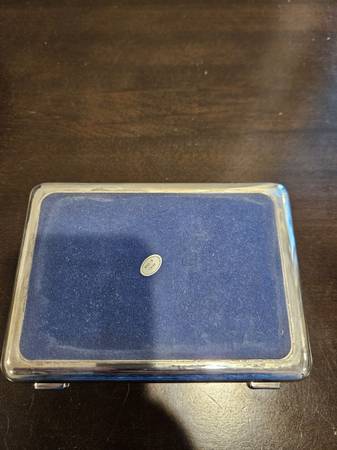 Small Silver Plated Jewelry Box with Mirror and Blue Velvet Interior. Exterior measures 5 3/8" wide x 4" deep x 1 5/8" high. Interior has a mirror and 4 sections for jewelry and 5 ring holder slots....