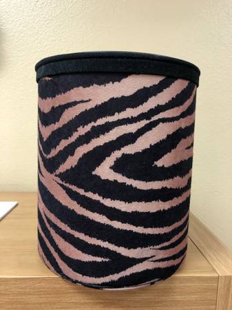 This is a used trash can in good condition. It is 9” in diameter and 9 1/2” high and has a plastic removable insert. The Kleenex box measures 5 1/2” square x 6” tall.