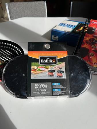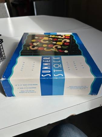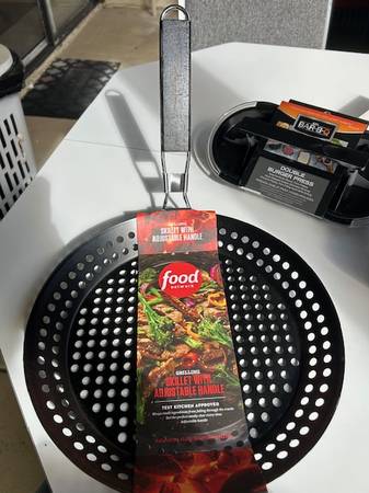 All new, unused items for great grilling! Food Network Skillet with adjustable handle, and Flip Basket (handle stores conveniently inside). Mr. BarBQ double burger press and Summer Stock Shish Ka Bob set. We consider reasonable offers!