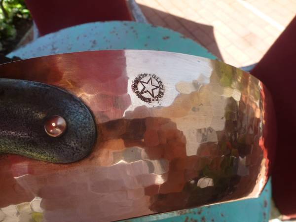 Hammered copper cooking unit in good used condition 16" diameter x 3" tall, 21" overall span Cast Iron handles with copper rivets Heavy gauge copper with tin cooking surface, weighs 8 pounds Made by...
