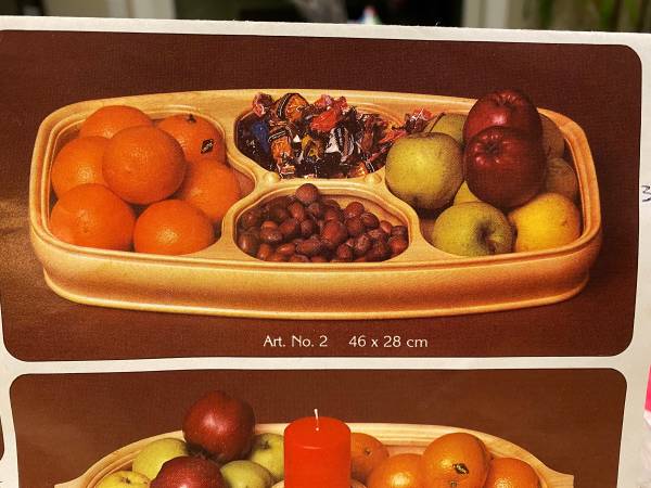 Vintage wooden bowls from Norway made of selected Scandinavian pinewood. The rectangularish shaped bowl measures 46x28cm which is 18”x 10 7/8” There are 2 of the three compartment bowl, 32x32 cm,...