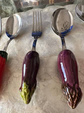 Lacquered handle Serving Utensils with colorful ceramic vegetable decor on the Handles: 4- pieces !!!! Eggplant Peppers These are not small like a cheese spreader. These are full size serving...