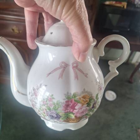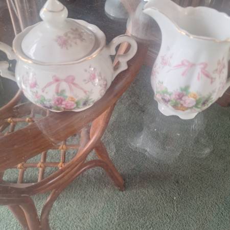 Pretty tea pot with sugar and creamer. 2 teacup and saucer. $35 Located in Capistrano Beach. Please text or leave a message