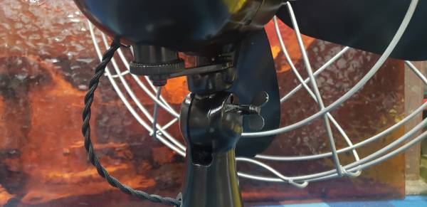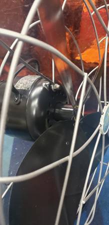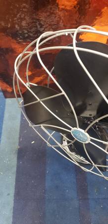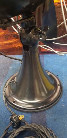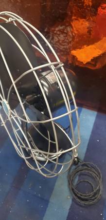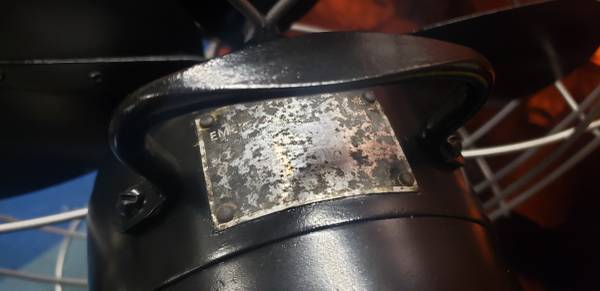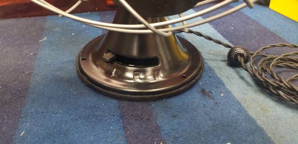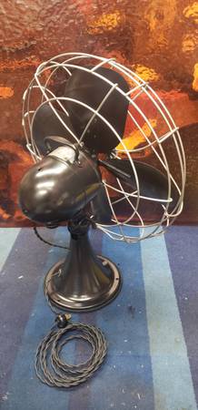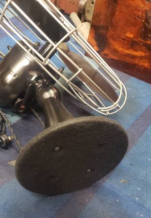 It has been completely disassembled and repainted back to original colors of black with silver cage and new reproduction style wiring and plug. The gearbox has been greased and the motor oiled along with new felt for the base plate. The original ID tag on the top is a bit hard to read still though to tell the exact model number of the fan. Works great moves a lot of air and ready for many more decades of use. (Nice and heavy cast iron base and body as well)