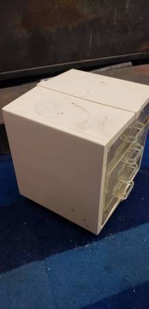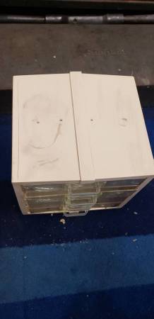 Nice little older plastic 4 drawer storage cabinet that could hold any number of things. About 6 1/2" x 6 1/2" x 6"