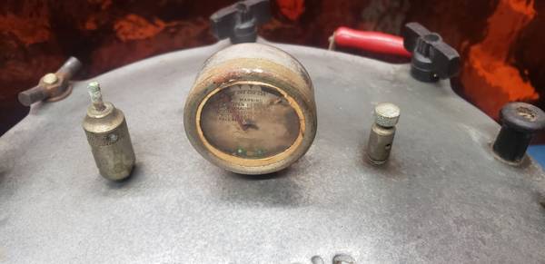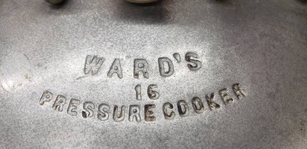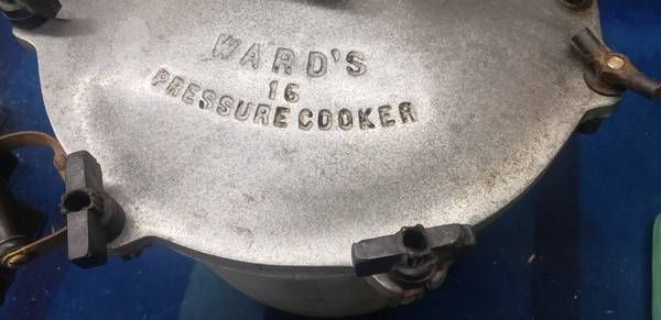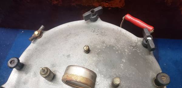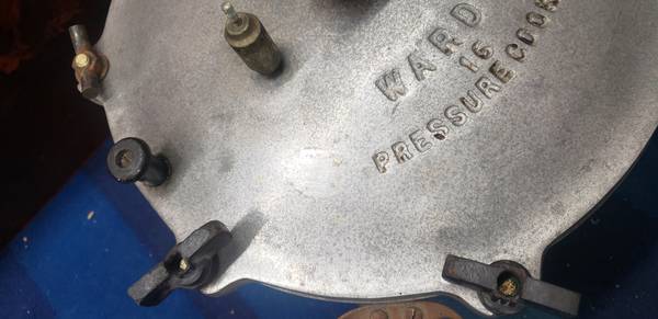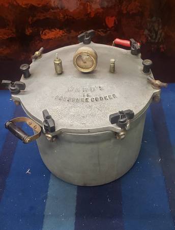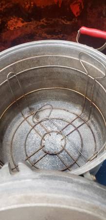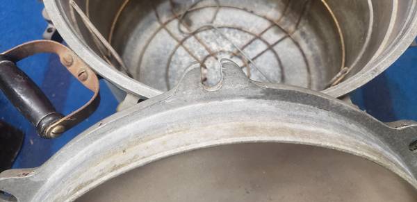 Has been sitting for many years and will need a good cleaning before using for food but over all in nice original shape. Pressure gauge still works. Comes with basket inside as shown. (Has 2...