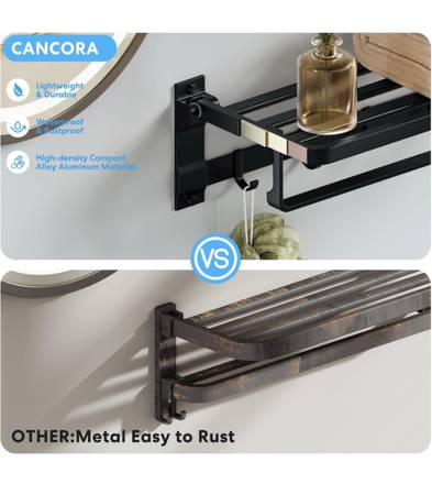 529 New 90° Foldable Towel Racks for Bathroom Wall Mounted with Rustproof Aluminum Towel Bar5 Towel Hooks 23IN Shelves Organizers Storage for RV Hotel Lavatory Kitchen Home Decor, Matte Black
