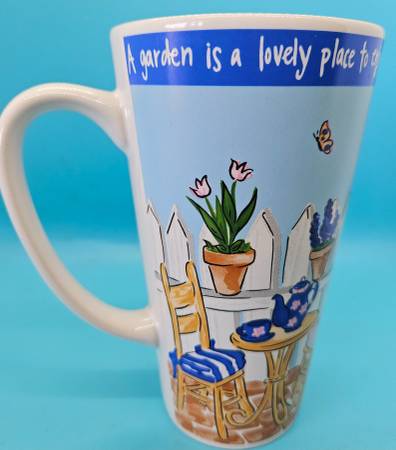 Holds 16 ounces of liquid. Writing around rim, goes around twice. Says; A garden is a lovely place to enjoy a cup of tea. No chips or cracks. 6112 Cross posted. NO HOLDS! If you'd like to pay in advance and pickup later, Venmo or Zelle, that is an option. Cash is still accepted. IT'S NOT SOLD UNTIL PAYMENT IS RECEIVED!