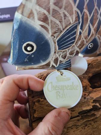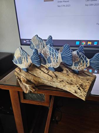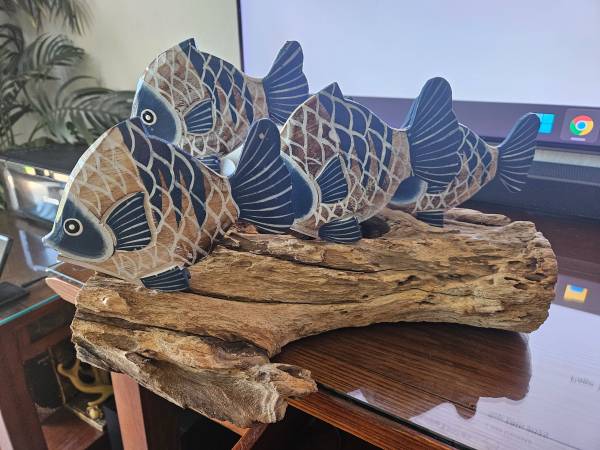 This is a brand new school of fish on driftwood centerpiece. It's made of wood and real driftwood. It's a one of a kind beautiful piece, very artistic. I paid $70 for it, but it just didn't match my decor, so you can have it for only $35. 14"W 9"D 9"H. Half off original Price.