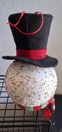 Snowman with a black hat and striped scarf sits on a shelf. Sits 10" tall. New!