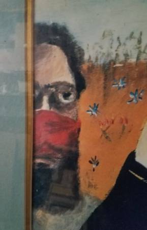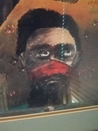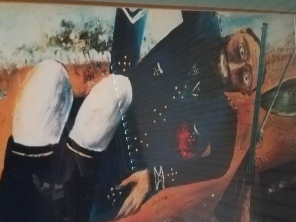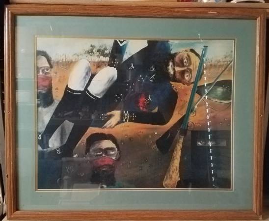 This measures 28" x 34". The wood frame has some wear and can use touch up in various areas. See all photos. Sergeant Kennedy, who had been chasing the Kelly gang, has been fatally wounded. Kelly noted that he could not let him die a slow death at the mercy of the elements, so intended to finish the deed. Nolan felt that at such dramatic life and death moments, it is as if everything is heightened and the world becomes quite eerily still. Sergeant Kennedy is wide-eyed; Ned Kelly and his gang look glazed and disconnected, aware that all is far from right with the world. Two guns cross one another, amplifying the idea of the two ‘warring’ factions of police and the Kelly gang. weighs about 11 pounds