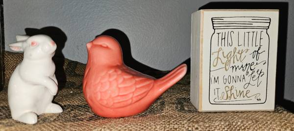 Get all these items in one purchase. Lot includes; Wood house measuring 3" x 5 1/2" & 7/8" thick., Little Light of Mine decor 3" x 4" & 1 1/2" thick, vintage collectible Goebel German ceramic white rabbit, vintage 8 oz Ball jar, artificial foliage, green leaf plate stand is 6 1/2" across & 8" tall, book - Making a White Garden that comes with clear book stand, (3) 9" white candles, crisscross 4 1/4" x 6" glass jar, green leaf 3" x 12" decorative bottle, silver 6" x 7 1/2" picture frame that holds 3" x 4 1/8" photo, Meito floral China hand painted 6" plate, (3) 1 1/2" x 1 1/2" colorful wood spools & orange 2 1/2" x 4" x 3" ceramic bird. 6579 Cross posted. NO HOLDS! If you'd like to pay in advance and pickup later, Venmo or Zelle, that is an option. Cash is still accepted. Shipping available if you pay postage. IT'S NOT SOLD UNTIL PAYMENT IS RECEIVED!