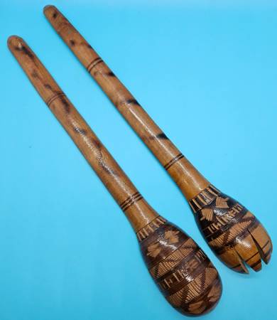 Vintage YE OLDE CURIOSITY SHOP SEATTLE Wood Hand Carved 11" Salad Serving Set