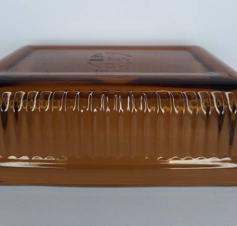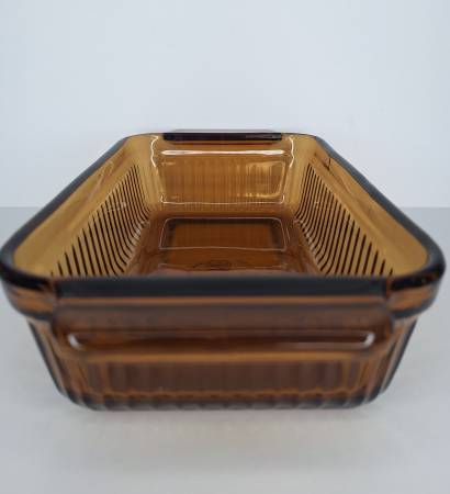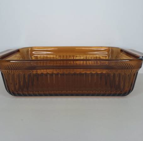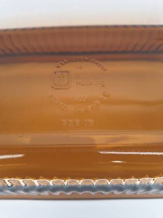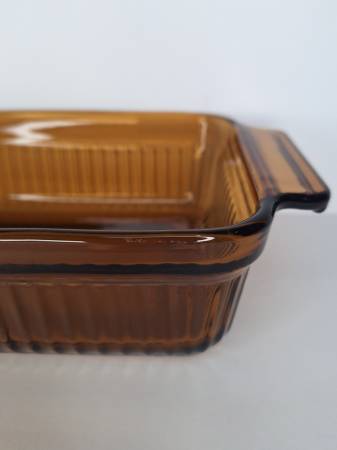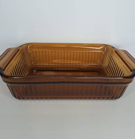 This Anchor Hocking loaf pan is a true gem for any mid-century modern collector. This particular piece was made in the 1960s. Made of durable amber glass, it features a rectangular shape, has a 1 quart capacity, measures 10.5 inches in length (handle to handle), 5.5 inches in width, and 2.5 inches in height. It is oven-proof and made in the USA. The pan has a darling vintage feel and is an original piece. Do not miss out on the opportunity to add this rare item to your collection or give as a gift to a collector!