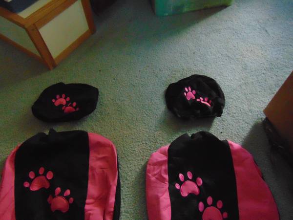 Black car seat covers with pink paws design. 2 Front seat and 2 rear seat with 4 head rest covers. New, wash able. $25 cash only. Open to reasonable offer.