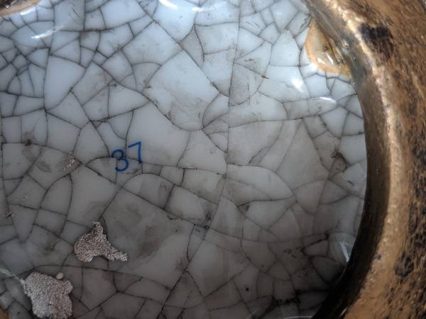 unusual and very beautiful european style floral crackled ceramic vase or bowl with faux brass base with four 'hooves'