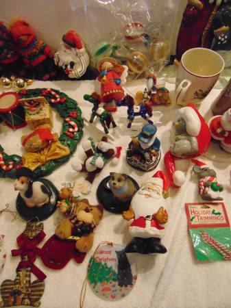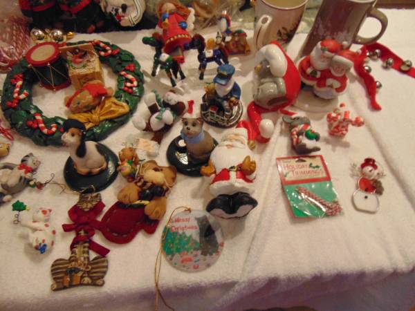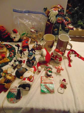 Box of Christmas decorations / items. Over 40 items including 2 mugs, 2 spoons, 2 small plush animals and a tin Santa. $ 20 for the lot. Cash only, Open to reasonable offers