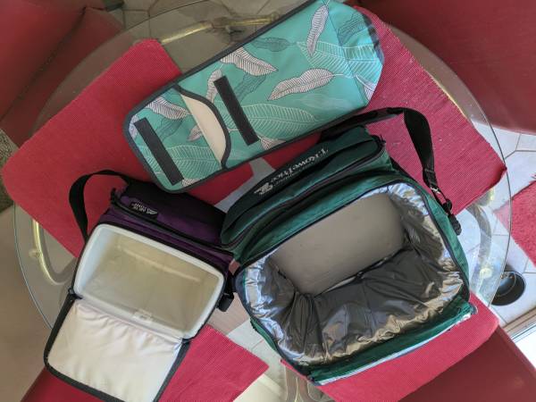 Cooler totes lot - large (12 pack), medium (6 pack), and wine bottle cooler. All 3 for $15. Excellent condition.