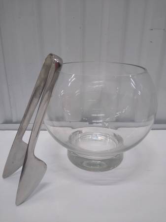 An ice bucket in glass with stainless steel ice tongs from Germany. The ice bucket is round in shape with a pedestal bottom. The ice tongs are made of stainless steel for enhanced protection and durability. Great gift for the home bar enthusiast. Dress up your entertaining with premium barware.