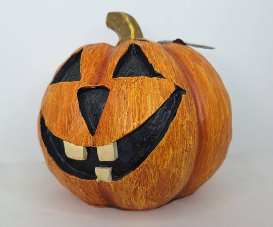 This jack-o'-lantern is orange with a distressed finish and vertical ridges mimicking the natural grooves of a pumpkin. The carved face is painted in black with a wide smiling mouth and three teeth....