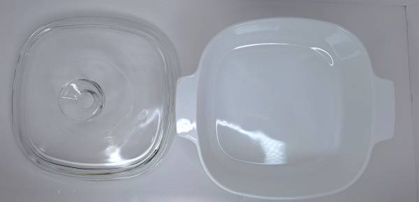1960s Corning Ware, A-2, 2 quart casserole dish in the iconic Blue Cornflower pattern and accompanying glass lid, A-9-C. The dish has handles integrated into its design and the lid includes a clear glass knob for easy lifting.