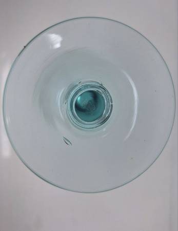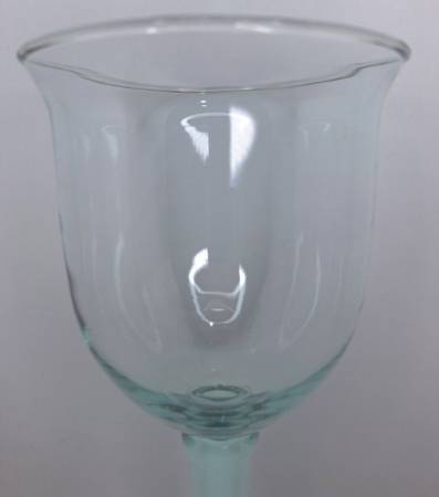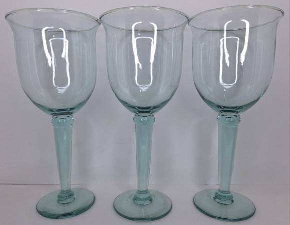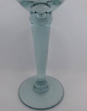 Handblown and crafted from recycled colored glass, these goblets have a beautiful light green hue, often described as sea foam or Spanish green, reminiscent of Caribbean water. They feature a tulip shaped bowl, a thick stem with a thicker knob detail, and a sturdy base. Suitable for various beverages, including wine, water, cocktails or even as decorative items like floating tealight candle holders. La Mediterranea is a Spanish company known for its handcrafted glass products, made in Valencia, Spain.