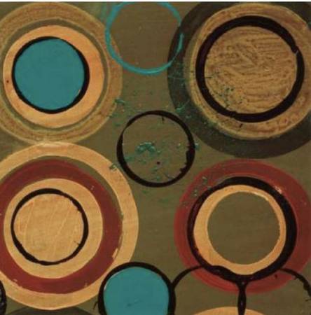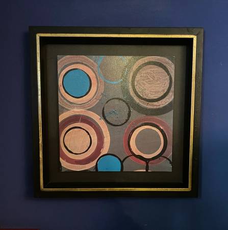 Art is purple blue mauve pink circles orbits spheres Art is floating inside cool black frame Art is on a board which measure 12" x 12" Frames measure 17.5" x 17.5"