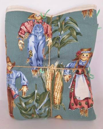 Ramblin' Round Roland's Field by Nicole de Leon for Alexander Henry Fabrics quilt was made in the 1990s. It is 100% cotton and features charming scarecrows in a cornfield, making it a popular choice for autumn and Halloween themed decor. The quilt has an off-white border and a matching green and off-white polka dot second side. The decorative scarecrow is made of straw, burlap, and fabric and has a wooden stick to stand upright.