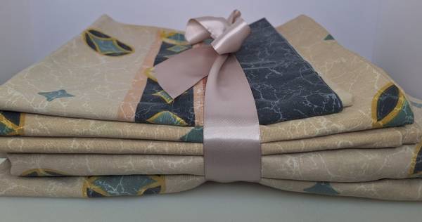 This '80s king sheet set is tan marbled colored with green diamonds. It is minimalistic, high contrast, and art deco inspired. It is glamorous as only the '80s were. It is made by Springmaid and is non-wrinkling percale.