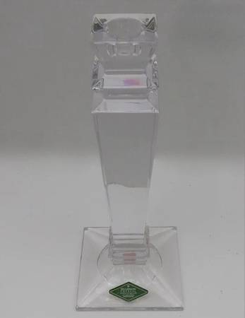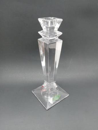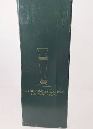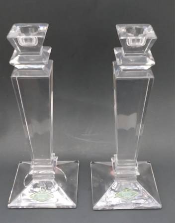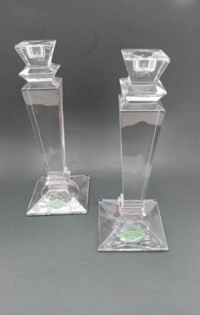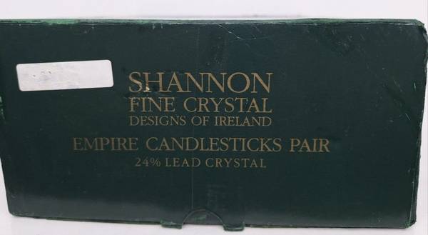 This pair of Shannon Fine Crystal Empire candlesticks are made of clear, faceted lead crystal with a distinctive square shaped base and top, designed to hold taper or dinner candles. Crafted from 24% lead crystal, they feature a modern, geometric shape. Designed in Ireland and crafted in Slovakia, this candlestick pair will make an excellent addition to your elegant home decor.