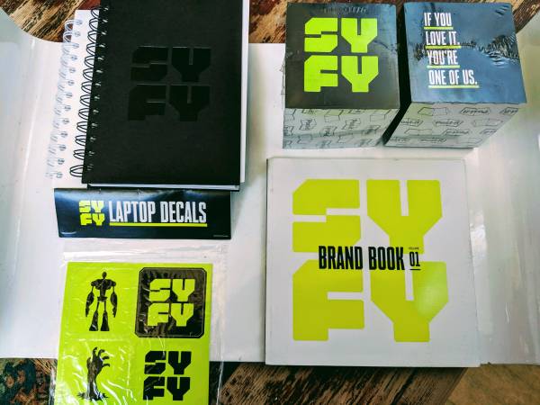 (714) 656-62-two-six $14 OBO all brand new in sealed packages SYFY Brand Reboot Merchandise - It's a Fan Thing SYFY Brand Book Volume 01 2 huge blocks of SYFY Post-Its 2 SYFY NoteBooks black and...
