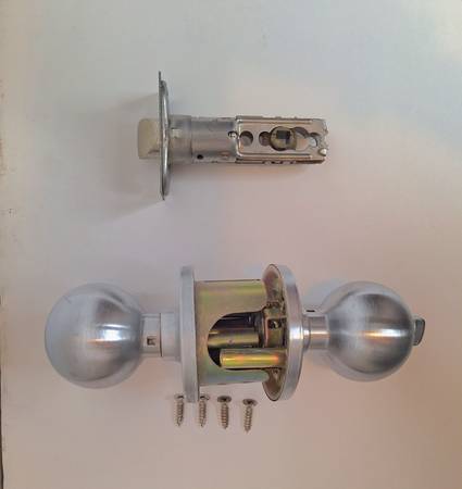 Reiser privacy door knob set in a satin nickel finish. Door knob is designed for interior doors where a locking function is needed, such as a bedroom or bathroom. Latch, face plate, and mounting...